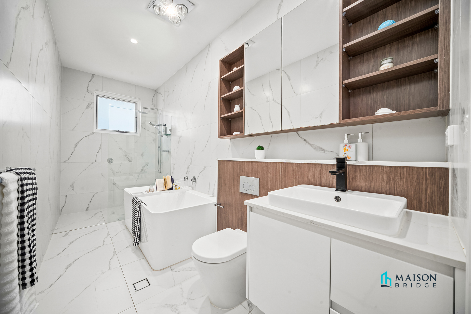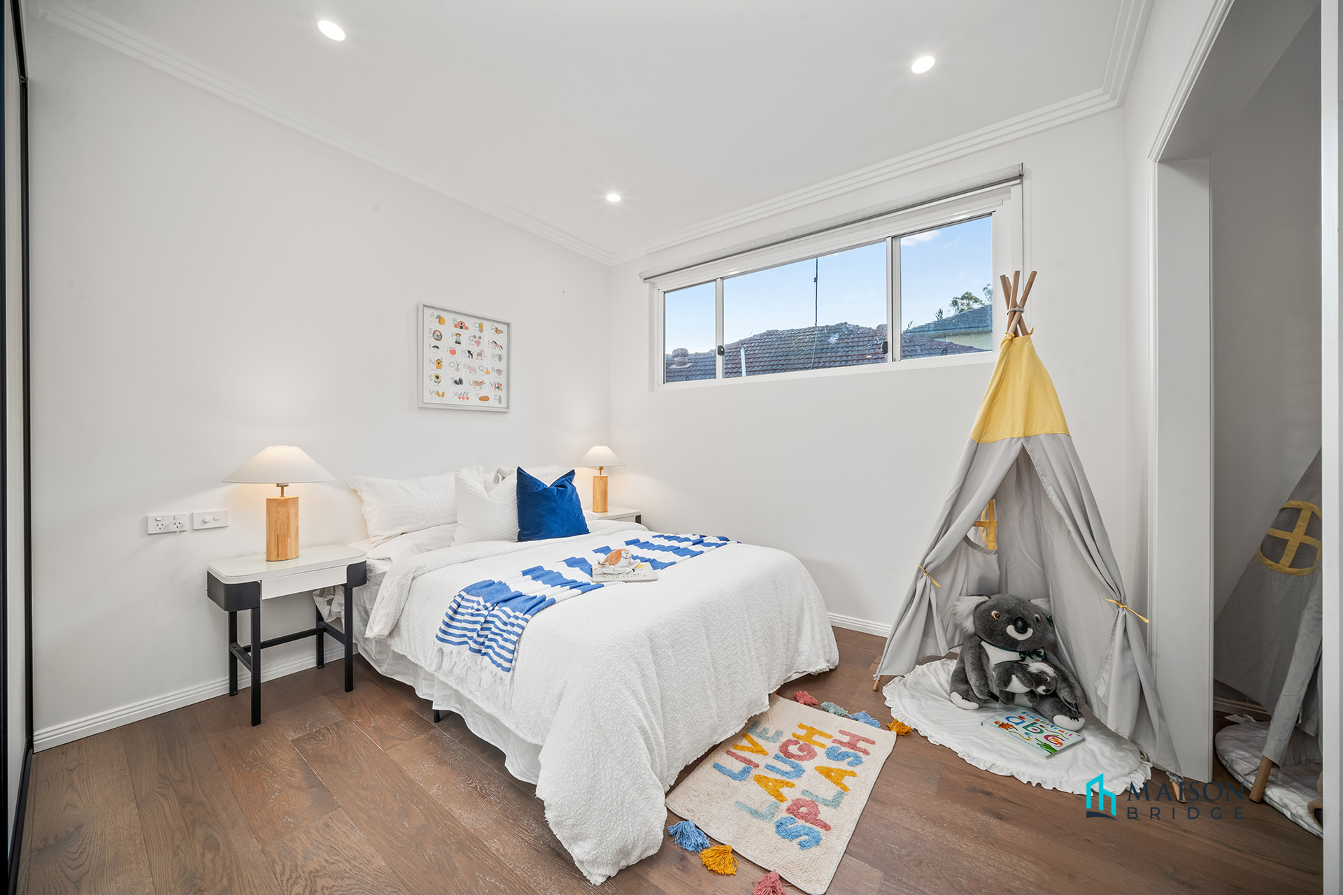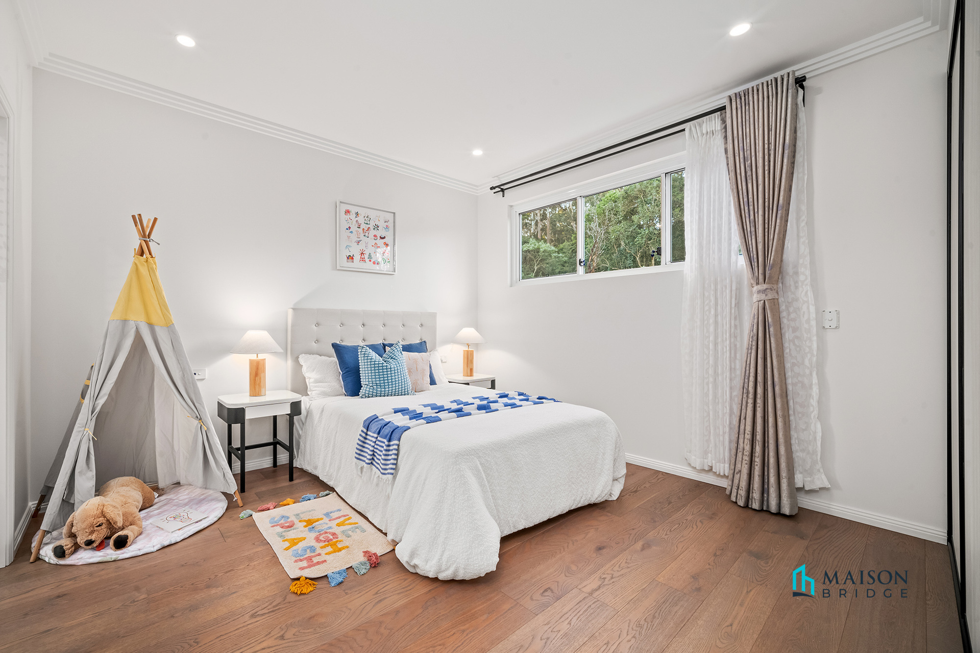 Upstairs, the master bedroom is connected to a private living area (or optional fourth bedroom), offering flexible use as a parents’ retreat or guest zone. Downstairs includes a fifth bedroom, ideal for guests or multigenerational living.