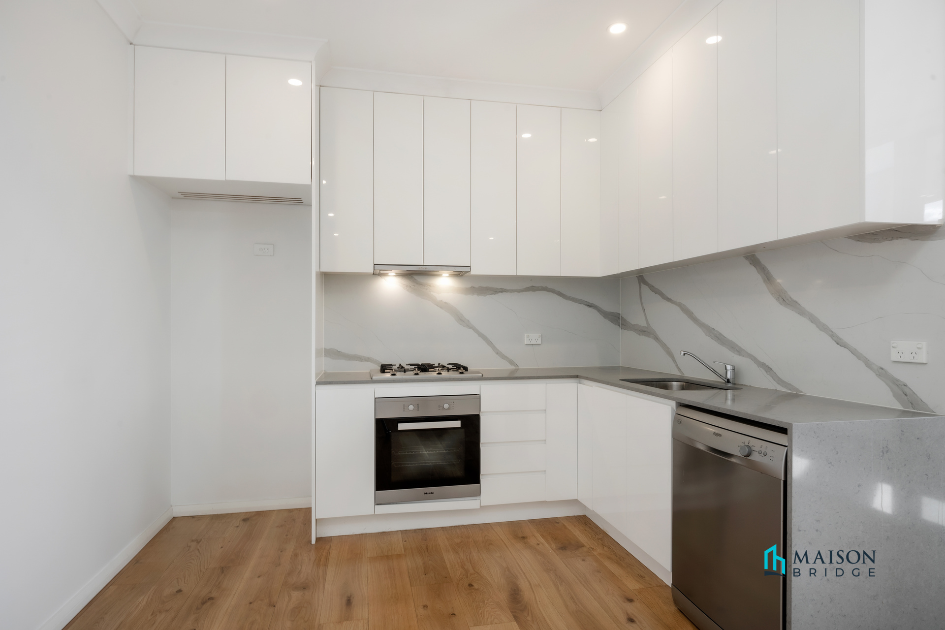 * Modern kitchen with stone benchtop, gas cooking, and stainless steel appliances