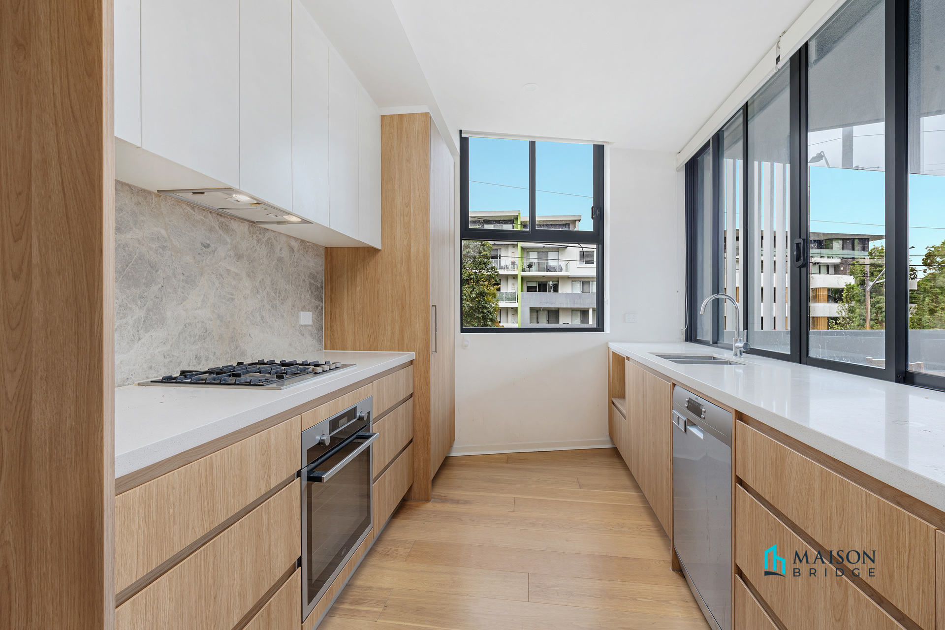 * Modern kitchen with stone benchtops, gas cooking, stainless steel appliances, and dishwasher