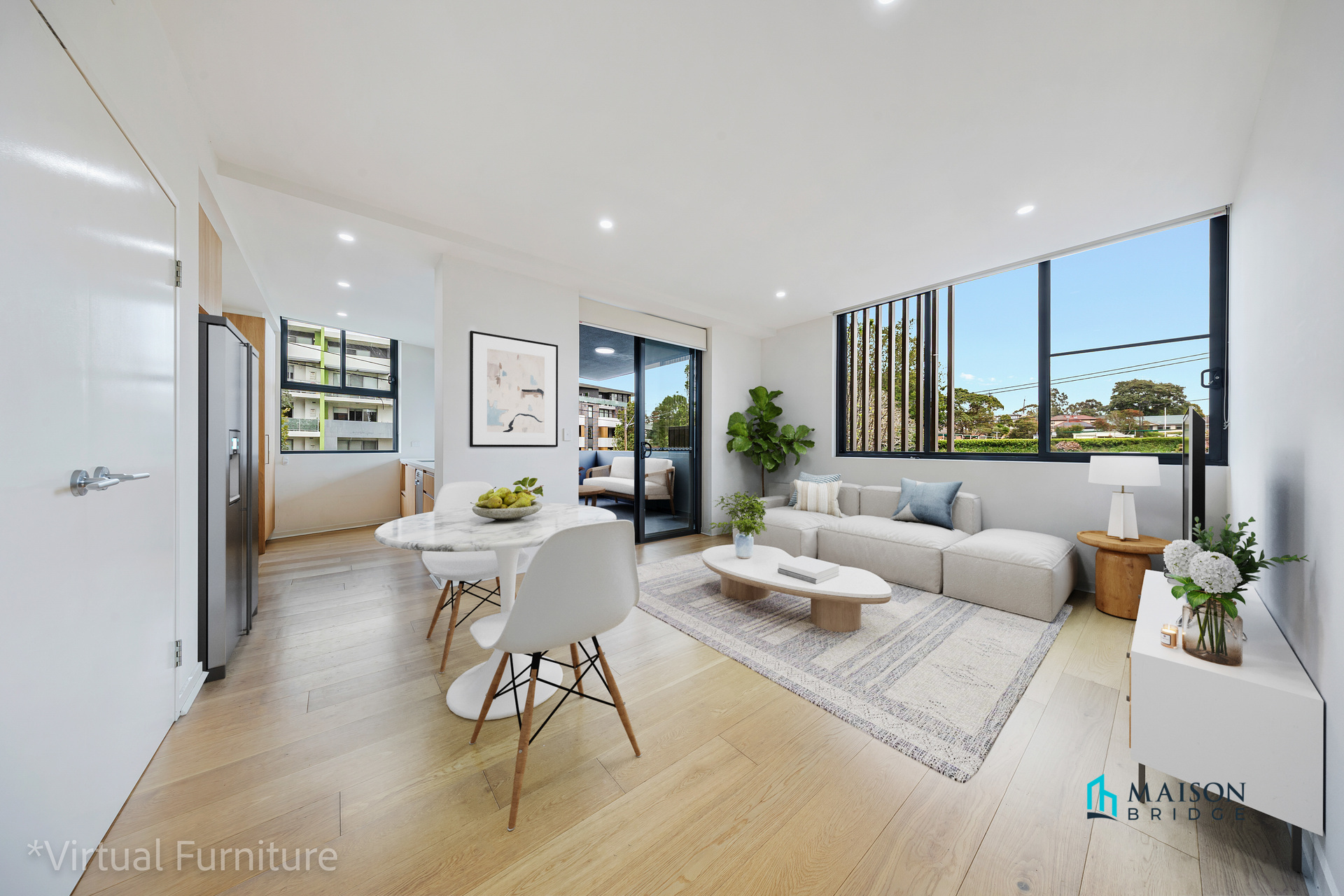 * Open-plan living and dining area with timber flooring throughout