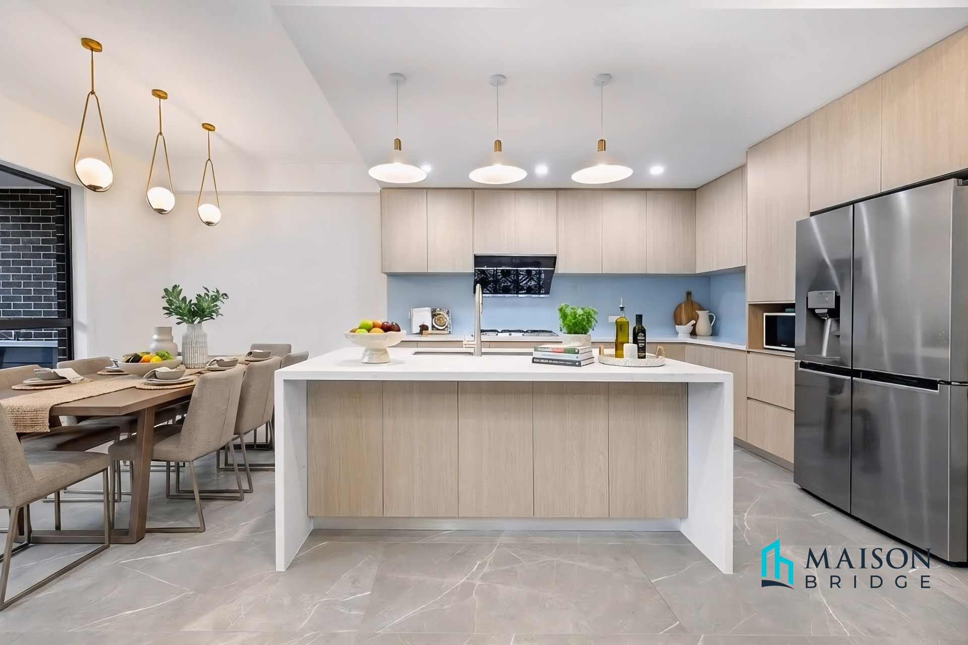 – Modern open-plan kitchen featuring stone benchtops, gas cooking and stainless-steel appliances